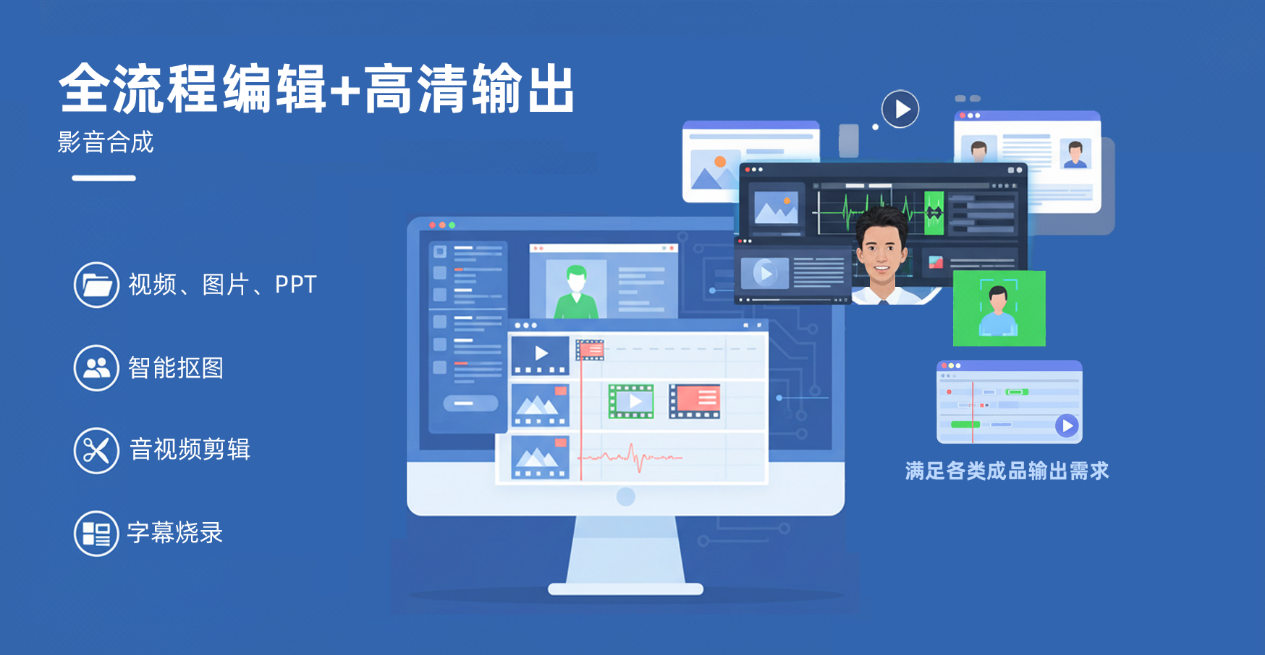 系统支持视频、图片、PPT等多类型背景与前景融合,提供从素材处理到成品导出的全流程服务,涵盖作品管理、精细编辑、格式适配全功能。用户导入背景素材后,借助智能抠图技术可分离前景人物或图像,完成色度键控、平滑边缘处理等精细化操作;同时支持音视频剪辑、多素材叠加融合、图文配音、封面帧设置,在保障高清画质的同时兼顾高效存储。导出视频支持字幕烧录,实现音、画、字精准同步,兼容主流播放器,满足宣传视频、教学课件等各类成品输出需求。